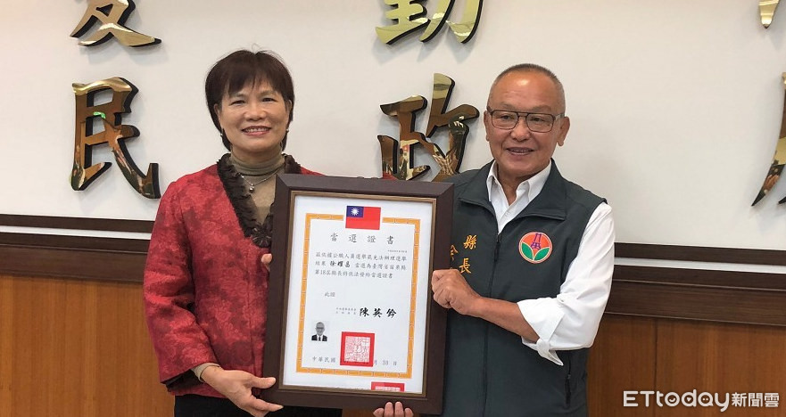 ▲內政部次長林慈玲今天前往苗栗縣政府,頒發苗栗縣長徐耀昌當選證書。(圖/記者黃孟珍翻攝)