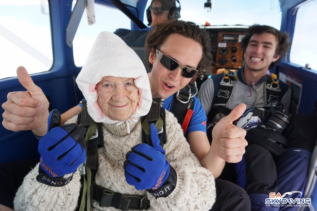 據了解,在這之前最年長的跳傘運動者是英國101歲又38天的Bryson William Verdun Hayes。