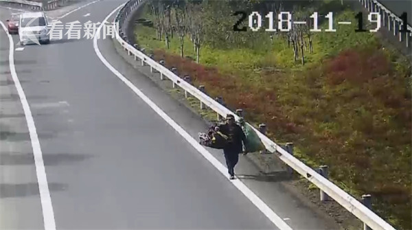 從錄影中還可以看到,徐姓老翁挑著擔子,身上掛著大包小包的行李,一個人徒步走在高速公路上,真的十分危險,幸好經員警尋獲後,將人從上面帶了下來。同事看到老翁被尋回後,又跪又敬禮地向警方表達感謝。