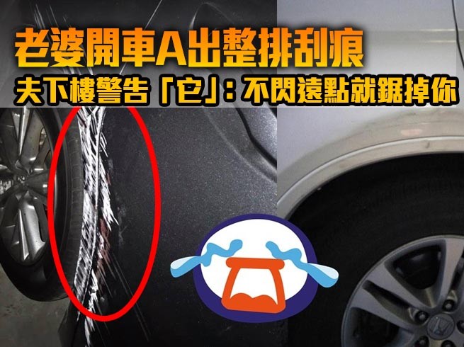 男網友在臉書《爆廢公社》貼出照片,只見一台深銀灰色轎車的右後輪上方,車體有許多白色刮痕,似乎是在倒車時擦到東西。原PO說,老婆回家後一直跟他道歉,他則是「覺得充滿鬥志」地回應「我說沒事我等等下樓去警告那根柱子『你他X下次不閃遠點我就把你鋸掉』」。