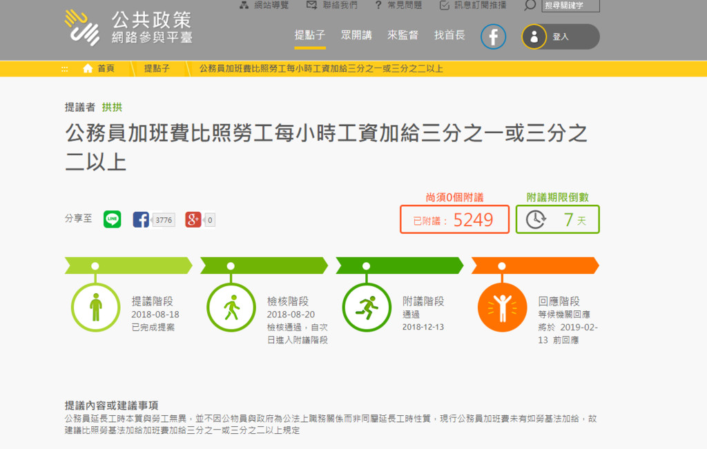 「公共政策網路參與平台」有民眾提案,「公務員加班費比照勞工每小時工資加給三分之一或三分之二以上」,這則提案於2018年8月18日開始提議,於12月13日成功連數達標,主管機關必須在60天內回應,也就是2019年2月13日前回應。