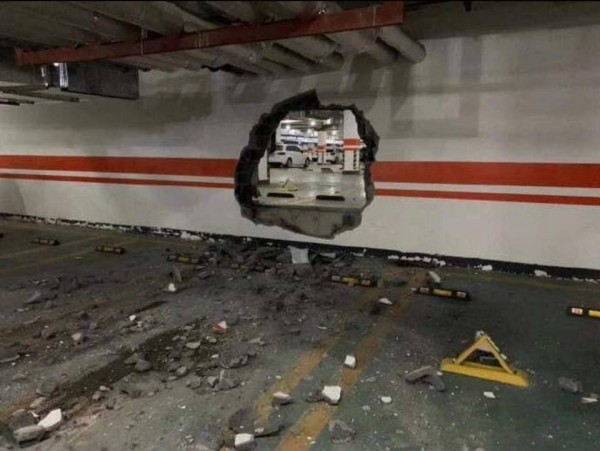 ▲油門當煞車踩!女三寶一秒撞破停車場牆壁,留下2米寬車形窟窿。(圖/翻攝自微博/下同)