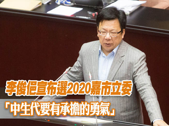 九合一選舉民進黨慘敗後,民進黨立委李俊俋拋「中生代提早全面接班」議題,外傳李俊俋要選嘉義市長或入閣,李俊俋14日在臉書發文宣布,他要選連任立委。李俊俋說,有中生代願意承擔,應該給予最大的支持,開啟中生代承擔責任,大家各就各位,在自己的崗位努力,「我的戰場在立院,因此我也在此宣布競選2020年嘉義市立法委員。」