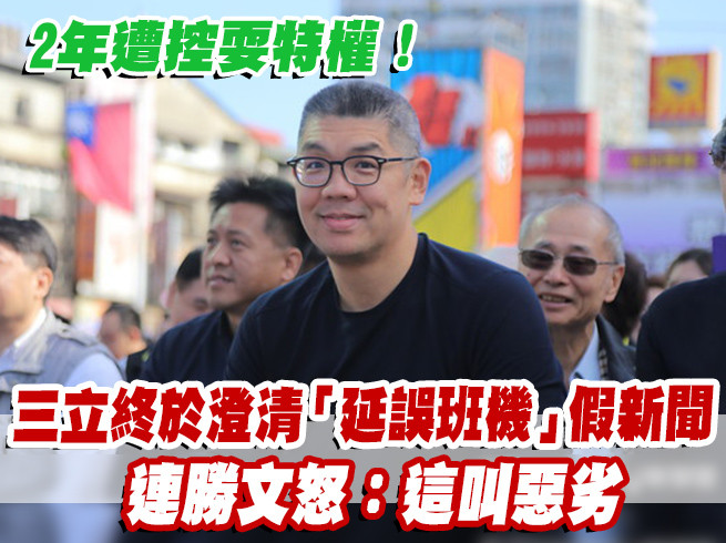 《三立新聞》在2016年4月14日以「全機都在等連勝文?起飛延30分乘客怒」為新聞標題,播報有爆料人T先生講述,連勝文匆忙就定位,飛機才關上艙門準備起飛,讓他當下覺得應該就是航空公司在等某個人,導致整班飛機旅客都在等待起飛。報導內容指,飛往香港的班機原訂9時10分起飛,連勝文在9點16分上機,飛機於9點37分許起飛,暗指連勝文「耍特權」耽誤全機旅客時間。