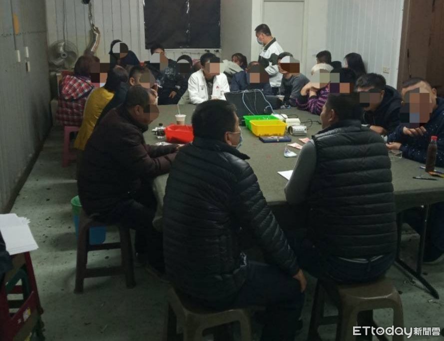 ▲台南市警三分局前往台南市安南區一處位於河堤旁的鐵皮屋,攻堅破獲天九牌職業大賭場,查獲鄧姓男子等26人,起獲賭資5萬餘元、天九牌、骰子、監視器等證物。(圖/記者林悅翻攝,下同)