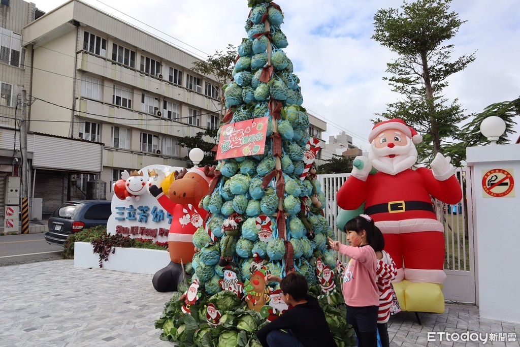 近日高麗菜價低迷,花蓮一家幼兒園靈機一動,將高麗菜布置成一棵耶誕樹,應景又吸睛。園長劉祝冠說,放學後還讓學童帶一顆回家,好看好吃又助農民,一舉數得。