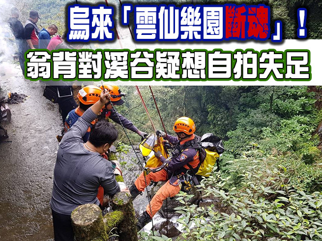 新北市消防局15日中午時分接獲通報,烏來雲仙樂園內有民眾墜落山谷,一動也不動;警消到場後立即垂降下谷救人,卻發現失足的老翁身上雖無明顯外傷,但卻因嚴重內出血早已經沒有生命徵象,明顯死亡。