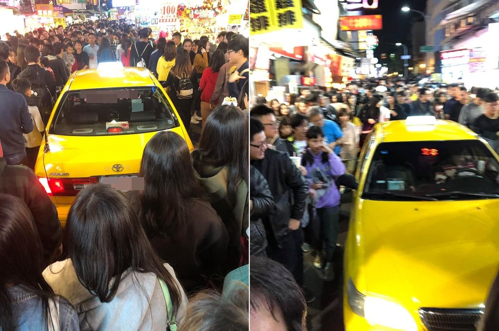 從網友PO在「爆怨公社」多張照片可見,在擠爆的一中街裡,有個「迷途小黃」卡在人潮中,仔細一看可發現這輛車內並未載有客人,前方顯示器還亮著「空車」2字;就算遭到現場近百名的路人猛盯、大笑,運將雖然眼神死,但仍堅持勇猛往前緩速行駛,一點都不畏懼。