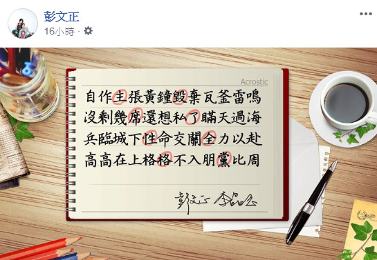 ▲彭文正在臉書上發表48字藏頭文。(圖/翻攝自彭文正臉書粉絲專頁)