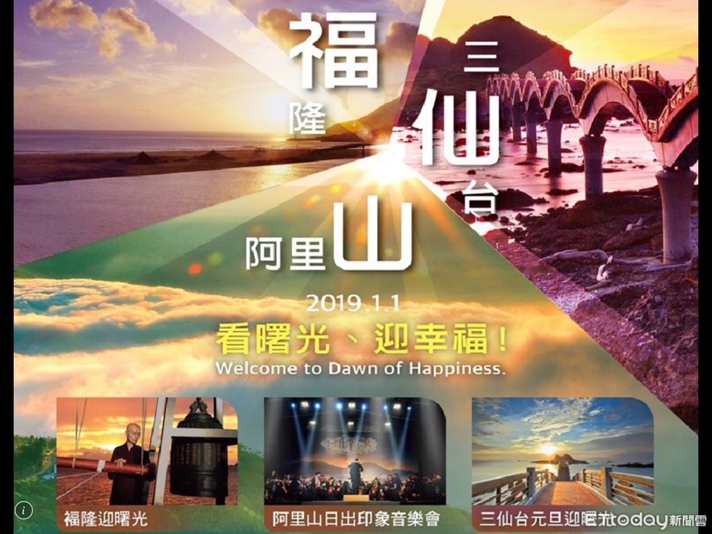 另外,交通部觀光局特別推薦全台最棒迎曙光地點:福、仙、山 (福隆、三仙台及阿里山簡稱),當天在三處進行SNG連線報導,希望民眾把握2019年第一個連續假期,好好規劃旅遊行程,迎接新年第一道曙光,許下新年新希望。