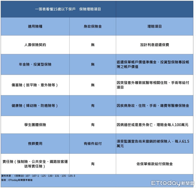 產壽險公會表示,目前15歲以下孩童無死亡身故保險金的規定,適用於個人壽險、傷害險,也就是壽險保障、旅平險、意外傷害險等,但不適用於健康險、年金險、責任保險、學生團體保險等。