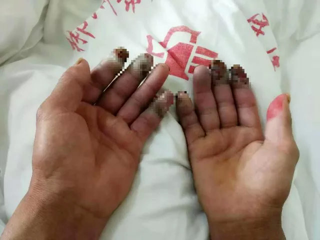 ▲谷男手指發黑,差點要截肢。(圖/翻攝自郴州發布)