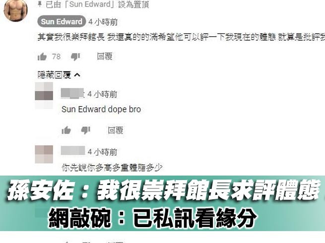 其實孫安佐這則留言一公開,不少網友立即幫忙「牽線」,光是留言區就有兩人表態已經私訊給館長,接下來就看緣分,搞不好還會開直播回應,「館長應該很樂意,哈哈哈」、「你是不是想上館長的直播?」、「體態好不好我不知道,但應該屌打9成同年齡的了」。