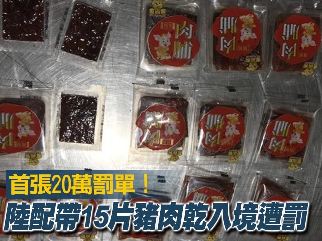防堵非洲豬瘟,農委會緊急調高裁罰基準,今(18日)天0時起,旅客攜帶疫區肉品入境,初犯罰鍰從5萬元提高到20萬元。而根據關務署台北關表示,一名何姓陸配上午從福州搭機抵達桃園機場,被海關查獲攜帶15片豬肉乾,總重約200公克,防檢局人員依法開罰20萬元。