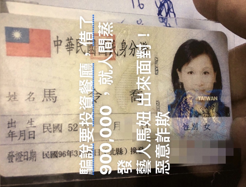 瑪麗在臉書社團「黑社會副本團」張貼馬妞的身分證,上頭寫著騙說要投資餐廳,借了90萬就人間蒸發,要求馬妞出來面對!副本一開許多網友熱烈討論,不過記者打電話求證,馬妞電話有通卻沒接,傳訊息到她的「馬妞報報」粉絲頁也是已讀不回。