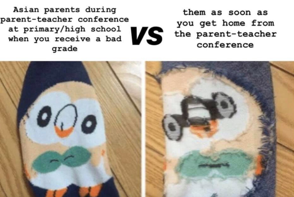 ▲推特上也有許多「微妙亞洲特質」的梗圖。圖在形容那些回家後就馬上變臉的亞洲父母們。(圖/翻攝推特@binchytroll)