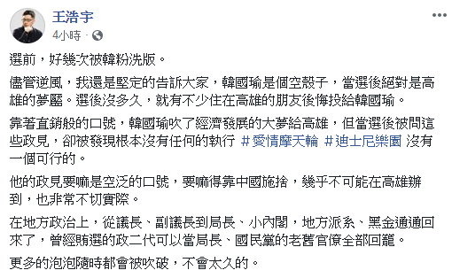 桃園市議員王浩宇在臉書上發文,選前好幾次被韓粉洗版,儘管逆風,「我還是堅定的告訴大家,韓國瑜是個空殼子,當選後絕對是高雄的夢靨。選後沒多久,就有不少住在高雄的朋友後悔投給韓國瑜。」不過面對王浩宇的批評,韓國瑜明快回應:「批判我的人都在排隊,請他不要插隊」。