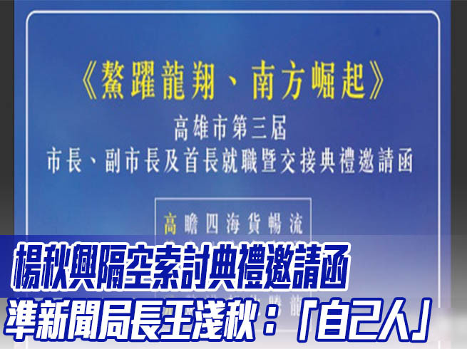 準高雄市長韓國瑜將在25日舉行就職典禮,不過現在剛從廈門回到台灣的前高雄縣長楊秋興接受媒體訪問時透露,自己沒有收到就職典禮邀請函,所以要跟韓國瑜索討邀請函,聽到這個訊息,準高雄市新聞局長王淺秋第一時間愣了一下,然後很疑惑表示他不是自己人嗎?