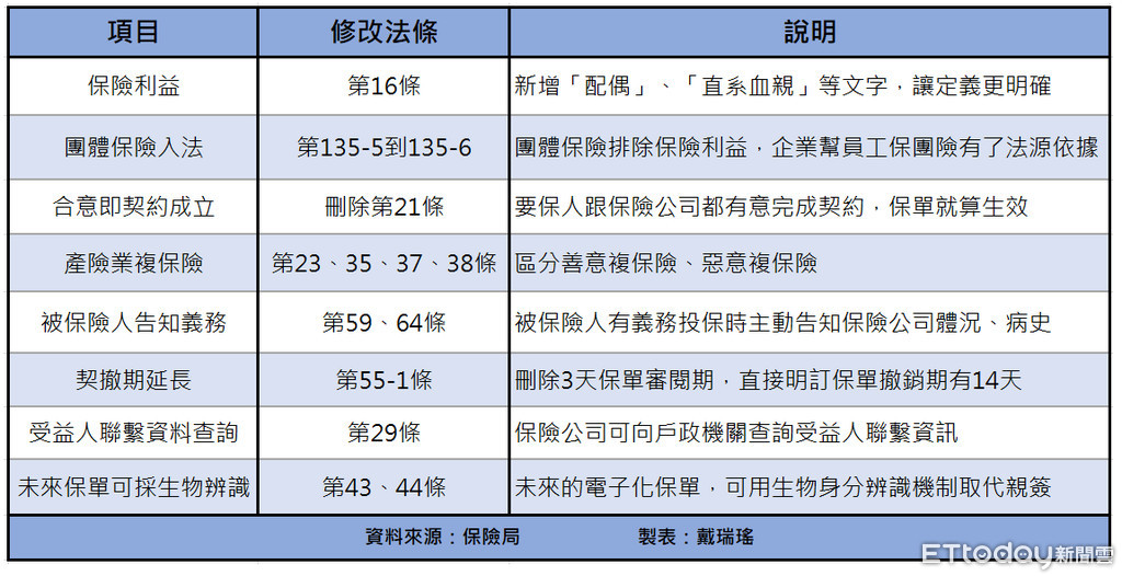 保險局預告,這次將修正《保險法》主要有8大項,依序是保險利益、團體保險入法、合意即契約成立、產險業複保險、被保險人告知義務、契撤期延長、受益人聯繫資料查詢、未來保單可採生物辨識。雖然法條艱澀,但《ETtoday東森新聞雲》特別以口語化方式,讓民眾一次就能看懂未來哪些保單權益可受保障。