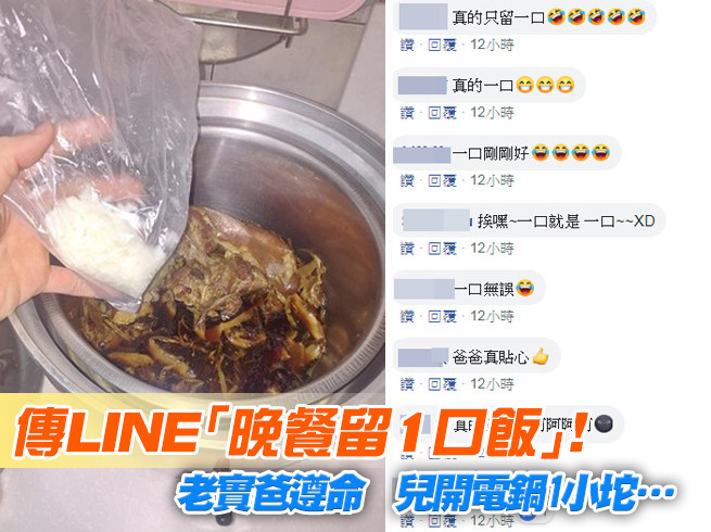 爸爸是守信的真男人!南投一名兒子深夜11點上班時收到爸爸LINE通知「家裡有腿庫」,他趕緊提醒老爸說「留一口飯給我吃」,下班後他欣喜飆速回家,一打開電鍋瞬間傻眼,因為真的只有「一口」飯,老爸說到做到,讓他超崩潰說「也太守信用」。