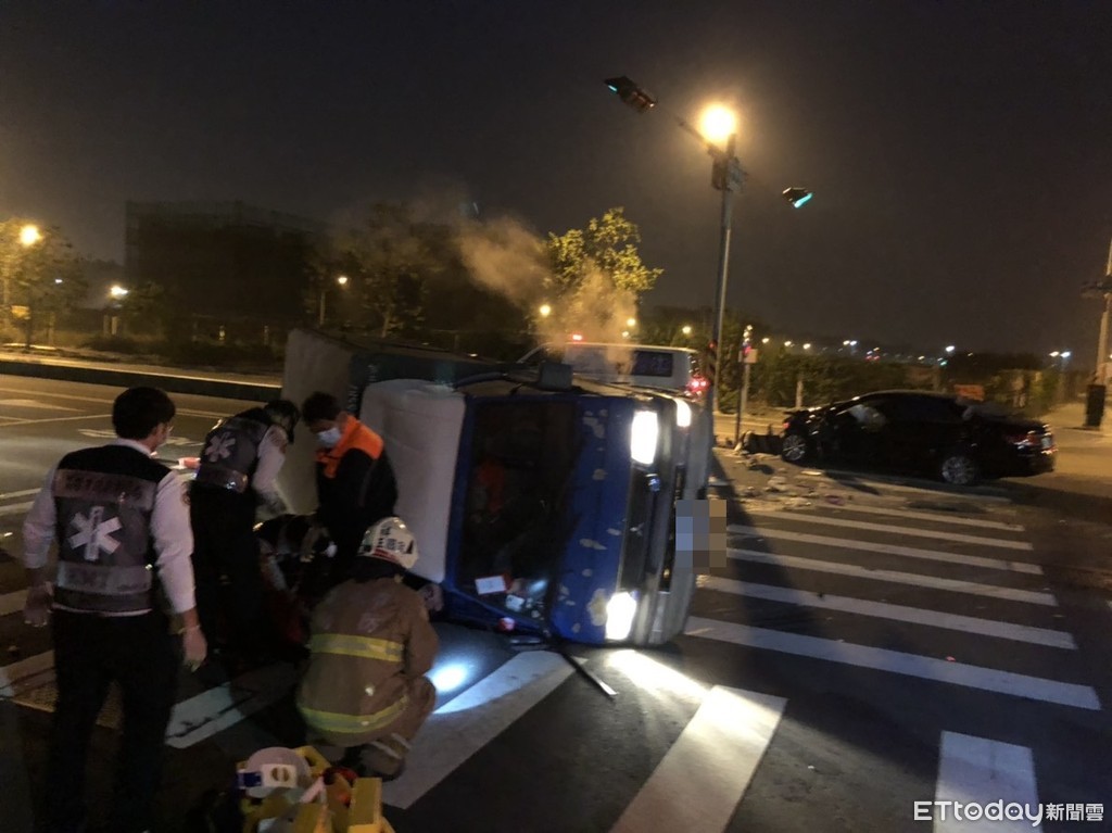 警消人員獲報後立即趕赴現場,初步了解自小客車的盧姓男駕駛,與另一部由劉姓男子駕駛的自小貨車在該路口時發生擦撞,自小客車後撞自安全島,小貨車則是翻覆,立即將受困車內的夫妻送至醫院內急救,目前張女情況穩定住院觀察中。