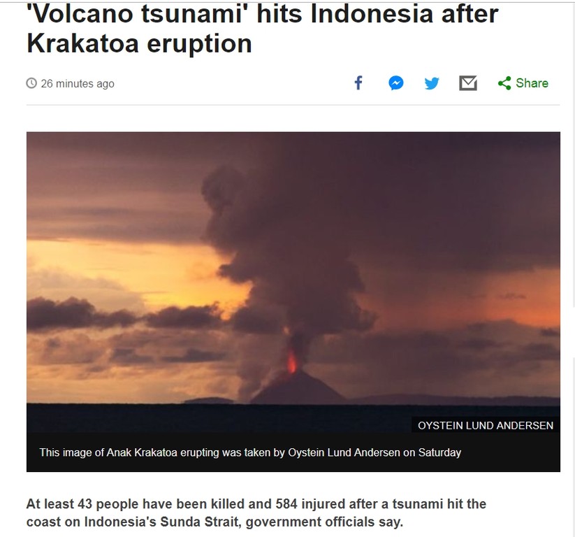 印尼巽他海峽22日晚上因火山活動引發海嘯,死傷人數攀升,官方資料顯示死亡人數已達43人,受傷人數近600人,中央大學水文與海洋科學研究所副教授吳祚任引用BBC報導在臉書發文指出,惡名昭彰喀拉喀托Krakatau 火山海嘯又來了,只是這次是由喀拉喀托之子(Anak Krakatau)火山操刀。
