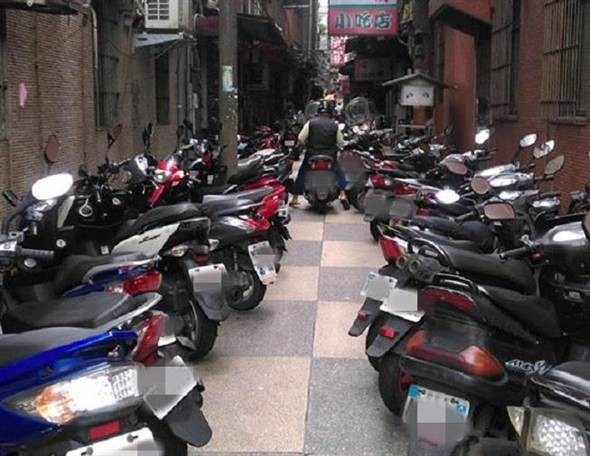 「想考機車駕照的朋友來孝三路65巷訓練就對了」,一名網友在臉書社團「基隆人大小事」中貼出這張照片,圖中可見,這條小巷子的兩側違停了兩排機車,僅剩下中間窄窄的小通道供人通過。畫面還剛好拍到一位男子正在穿越這條窄道,為了取得平衡,所以雙腳著地,感覺要花一番功夫才能駛出。