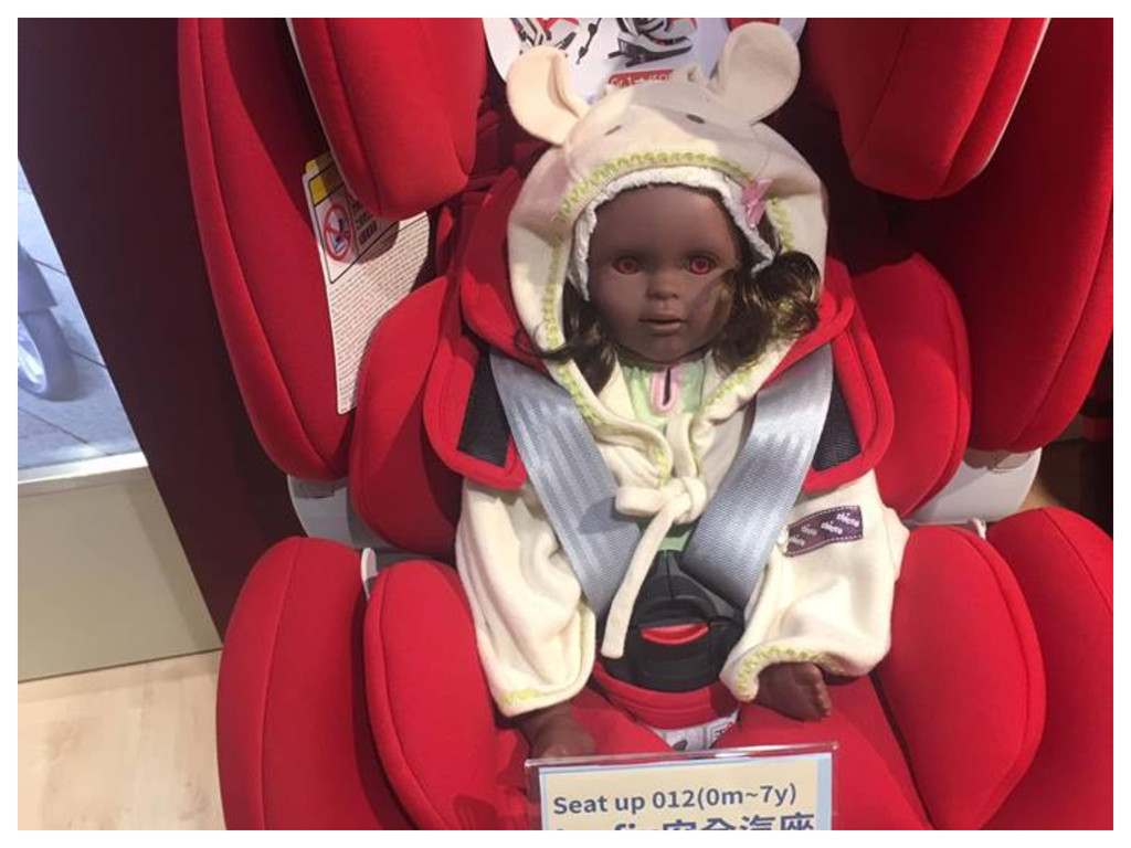 原PO表示,「一進門就這麼驚悚好嗎???你給叔叔說說妳有什麼未完的心願」,並附上一張圖片,圖片中娃娃坐在安全座椅上,有相似巧克力的膚色,眼睛則是紅色,因為披著斗篷,看起來像四肢不全只有雙腿,整體樣子讓人看了會覺得有些毛毛的。