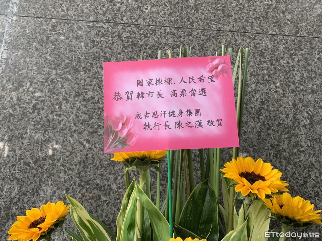 準高雄市長韓國瑜還沒進入市政府,不過祝賀已經先到了,而且送花的人就是成吉思汗健身集團執行長,綽號「館長」陳之漢,花架就擺在市政府四維路大門口,相當顯眼。