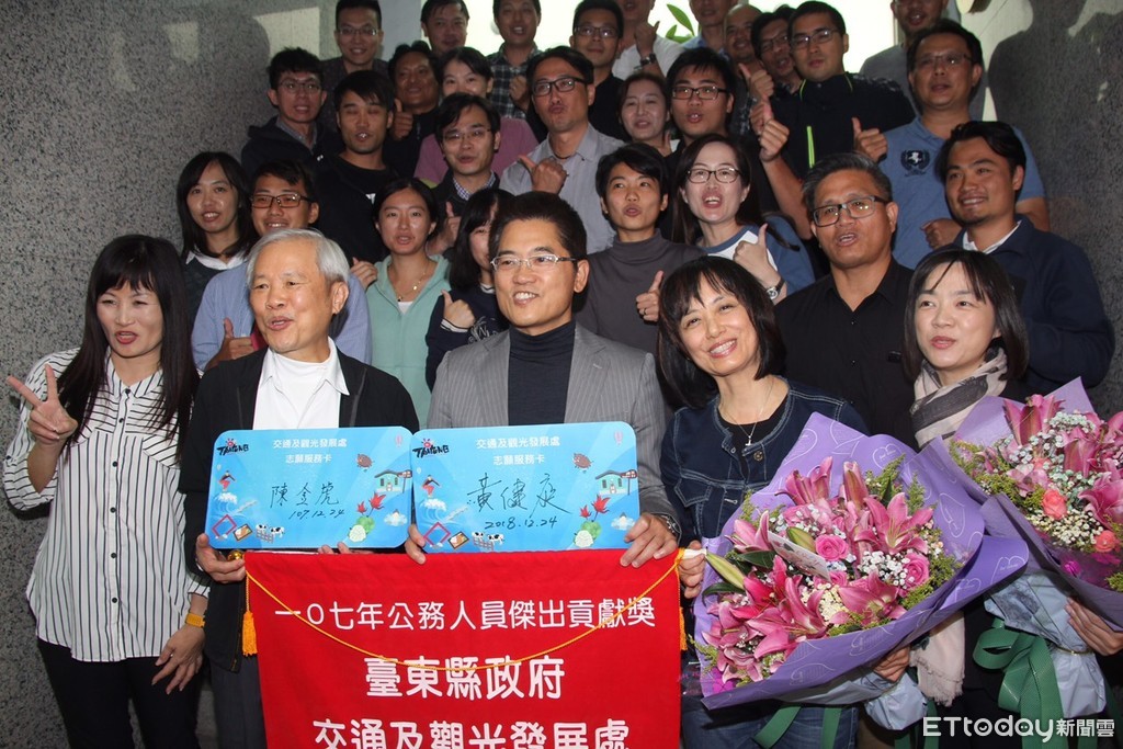 ▲台東縣長黃健庭任期最後一天也是副縣長陳金虎(前排左二)公職生涯的最後一天,碰巧也是夫人的生日,許多局處單位還獻上鮮花與卡片,並且跟縣長及夫人擁抱。(圖/台東縣政府提供,下同)