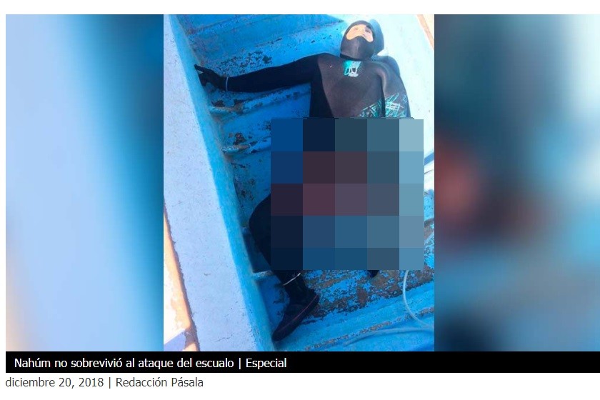綜合外媒報導,這起意外事件發生在當地時間18日上午11點左右,35歲的艾奎里拉(Nahum Verdugo Aguilera)與朋友一起到墨西哥西北部索諾拉州的佩尼亞斯科港釣魚和潛水,遇到鯊魚攻擊,左半邊腹部、腿部和生殖器都被咬掉了,他的朋友提到,當發現艾奎里拉被攻擊時,他們立即開船過去救人,但當時就已經沒有生命跡象。