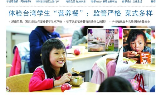 ▼南都網介紹台灣營養午餐,同時張貼鳳凰縣所得小學學生吃不飽的消息,形成強烈對比。。(圖/翻拍南都網)
