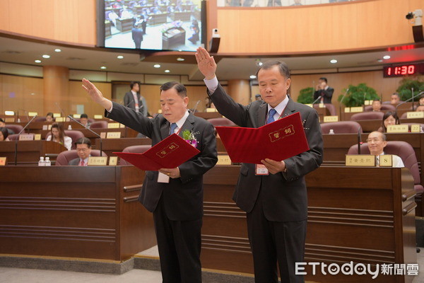 ▲桃園正、副議長選舉,邱奕勝(左)、李曉鐘各拿下42票再度連任。(圖/桃園市議會提供)