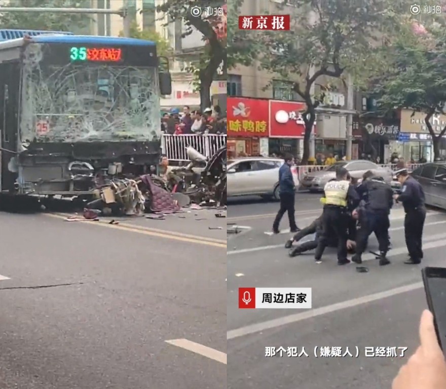 新京報上傳的影片中可見,公車正面凹陷,玻璃幾乎全部碎裂,前方有許多機車、汽車殘骸,更有許多受害人倒在路中央,警察正在制伏一名男子。錄影的男子說道,「公交車裡面那個報復社會,好像」。