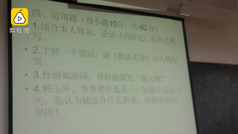 出題教授張彩麗表示,這堂課是開卷考試,學生們還可以帶手機;其實這些考題不是需要學生們進行多麼嚴謹的論證,主要是希望學生們在答案中體現出對文學作品的了解,「大部分題目都需要聯繫原著內容作答,從答案裡就能看出來學生對文學作品的熟悉和掌握程度」。