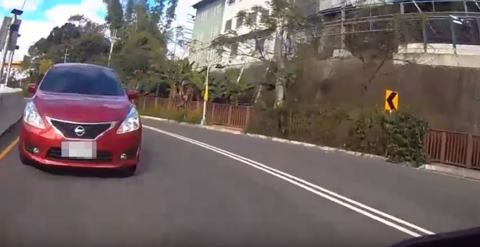 一名重機愛好者26日在臉書「爆料公社」PO出一段影片,指稱行經台中市東山路時遇到一輛紅色轎車逆向,剛好那個路段又是髮夾彎,直到轉過去的瞬間雙方駕駛才看到彼此,「漏了兩滴,這條命是撿回來了。」