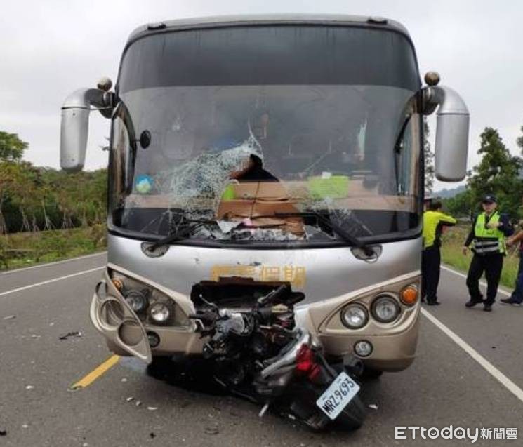 ▲遊覽巴士疑似為超車逆向,不慎撞上對向騎士,騎士送醫不治。(圖/記者翁聖勳翻攝,下同)