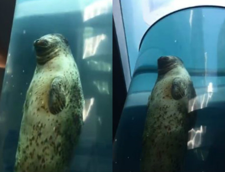 「叮咚!3樓到了!」電梯服務員怎麼從小姐變海豹?微博用戶「霓虹網友」上傳一段5秒影片,有一隻海豹臉部表情安詳,一邊閉眼睡覺一邊任水壓漂浮,從水族管底部緩緩升起,表情絲毫沒有改變,讓網友笑慘「居然練成升天了」。