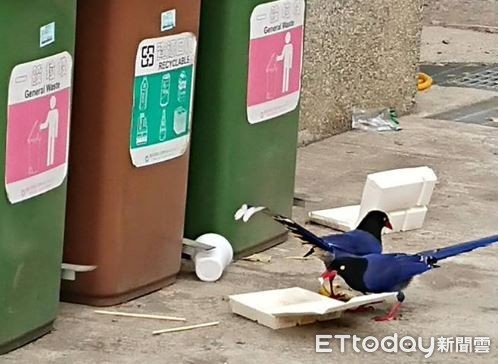 南投縣的惠蓀實驗林場在粉專放上一張照片,幾個便當盒堆疊在垃圾桶上方,還有幾個跟免洗杯一起散落在地上,引來3隻保育類的台灣藍鵲徘徊,其中還有1隻在吃便當盒的殘食,讓園方相當擔心,發文提醒遊客「丟完垃圾要確認蓋子有蓋上」。