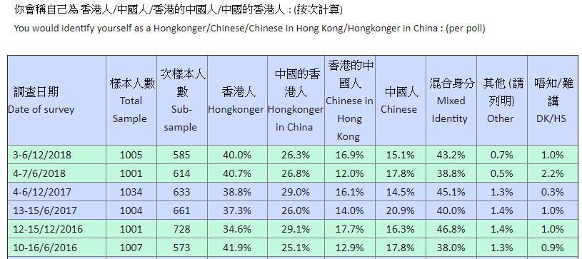 香港大學民意研究計畫3日至6日電訪了1005名香港市民,主要是問及關於種族認同的問題,以0到100分來計算出「身分認同指數」,其中獲得最高認同分數的為80.8分的「香港人」,遠高於「中華人民共和國國民」的57.1分。但當讓受訪者從有關香港及中國的4種身分中選一個作為自我認同時,有6成的受訪者都認同自身身分跟中國是緊密相連的;據數據顯示,在香港支持港獨的青年也在近年來有所下滑,而泛民派近期的選舉接連失利,也間接減少了支持反對派的年輕市民。