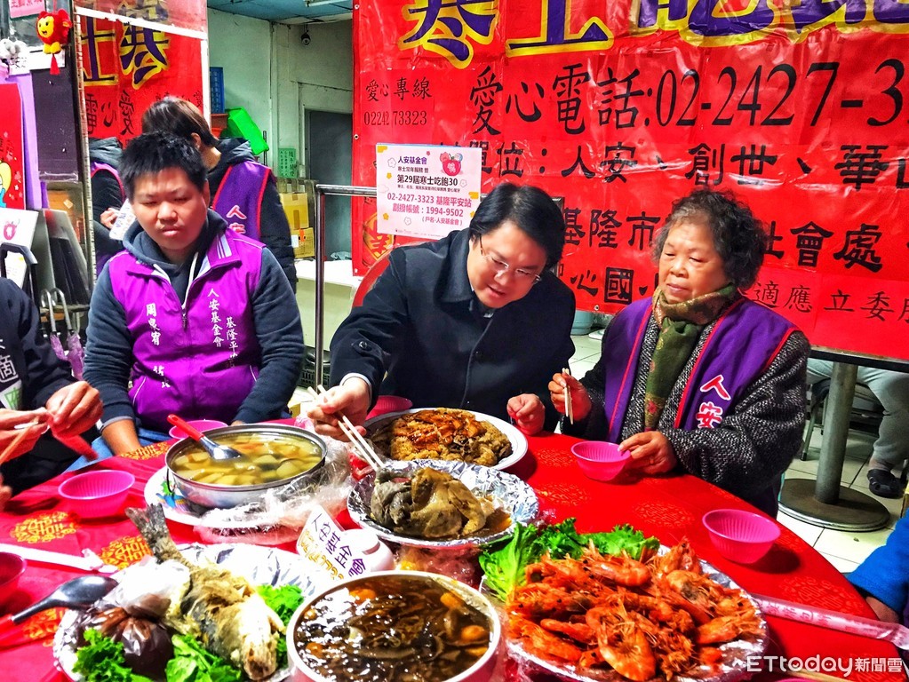 寒士吃飽30尾牙已進入倒數30天,經費募集尚缺7成。基隆市長林右昌28日到「人安基金會基隆平安站」,化身上菜天使,搶先秀出寒士尾牙菜色並幫寒士夾菜。藉此呼籲平民助貧民,一起小額捐款,助寒士尾牙基隆場順利舉辦。