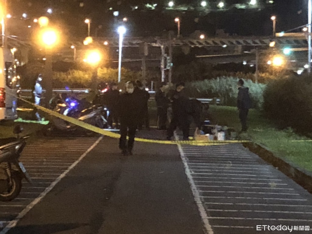 ▲▼機車就倒在停車場內的機車停車格,警方28日晚間11時許發現後,在現場拉起了封鎖線。(圖/記者趙永博攝)