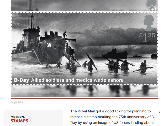綜合外媒報導,該紀念郵票的預覽圖於本周四(27日)在推特曝光,圖說寫著「登陸日,盟軍士兵及醫護兵涉水上岸」,但是郵票中所使用的照片,卻是美軍於1944年5月17登陸荷屬新幾內亞薩米鎮的時候,士兵抬擔架上岸的畫面,這個地方距離法國諾曼第海灘約1萬3679公里遠。