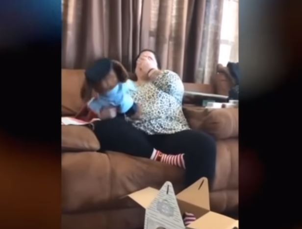 ▼母親強顏歡笑的拆著禮物。(圖/翻攝britmgarcia的推特,下同)