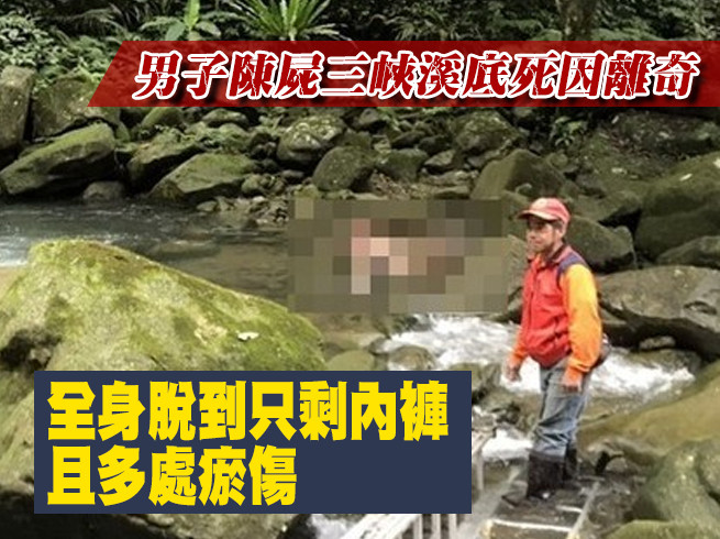 新北市三峽區民眾於本月29日下午,在鹿母潭溪底發現一名男子赤裸泡在冰冷水中,急忙報案,警、消抵達發現男子明顯死亡,呈現浮腫狀態,全身上下只穿一條內褲,身上又多處瘀傷,目前已打撈上岸,家屬到場認屍後表示,死者在外欠下近600萬元的債務,因此懷疑是遭人毆打致死棄屍!