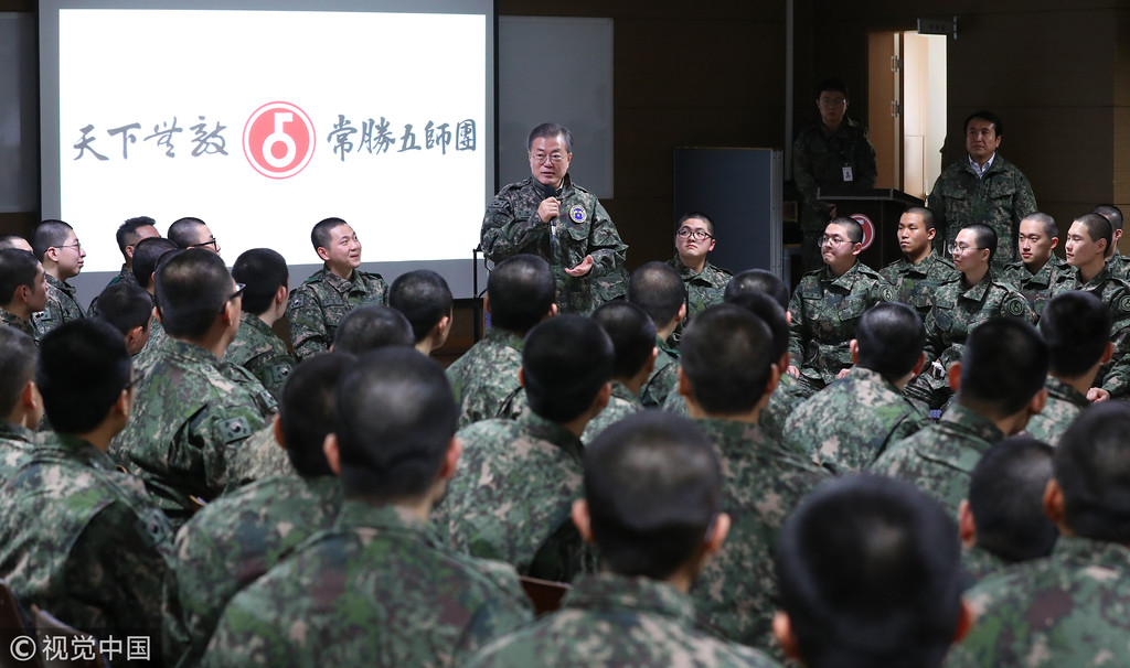 ▲ 文在寅上台致詞鼓勵前線士兵時,身後投影片出現「天下無敵常勝五師團」9個中文字 。(圖/視覺中國)