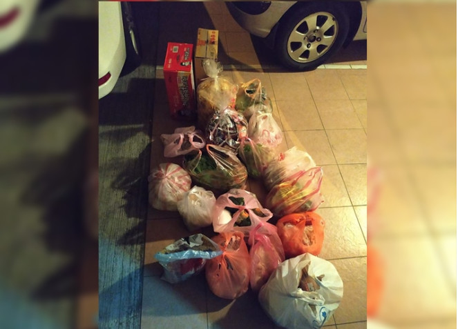 從男網友PO在臉書「爆怨公社」照片可見,地上全被蔬菜、水果、泡麵、一大袋的米佔據,整整17袋、2箱超級大陣仗,多到排排站至少有1公尺長,儼然已成了「行走的大冰箱」,應有盡有完全不怕孩子餓到。
