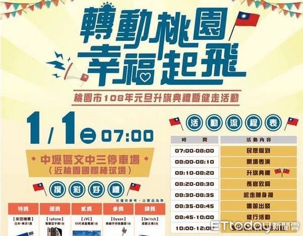 桃園市2019年元旦升旗典禮暨健走活動,明天在中壢區青埔高鐵特定區文中三停車場舉辦。由於主辦單位為此次活動,準備豐富的紀念禮以及日本東京來回機票大獎等摸彩品,吸引許多民眾爭取參加。主辦單位呼籲,元旦早上7點到8點受理參加民眾報到,請民眾不要錯過報到時間。