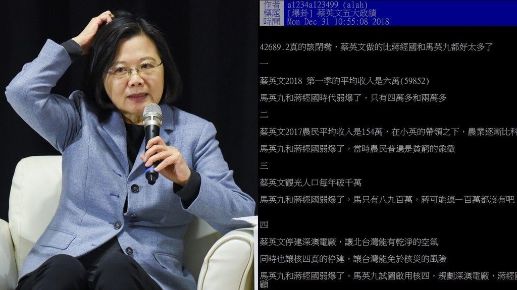 文章貼上網,很快就吸引大批鄉民狂推,「蔡英文這2年經濟、外交、薪資遠勝馬英九」、「蔡英文真的屌打」、「金管會就比前任做出很多事,經融界清楚很多事」、「高雄月入六萬的(人)漂過,還沒算進年終」、「講真的,股市上萬點這件事就屌打」、「做得再好只能一任,哭哭」、「真的,2020大家知道該投誰了。」
