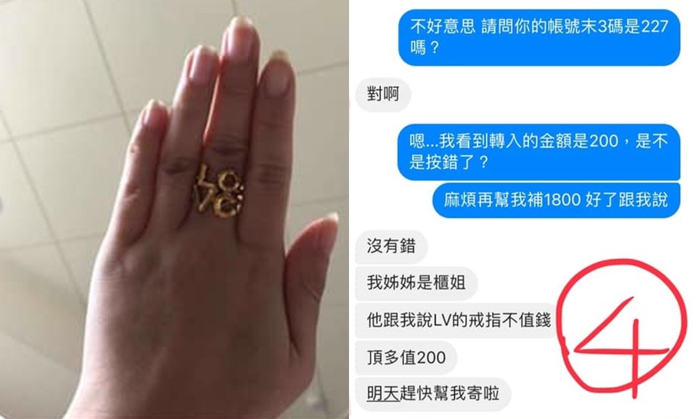 隔沒多久,女子就說自己匯好了,還指定「明天就要寄」,因為自己急著要。原PO便去確認帳戶,沒想到卻看到女子只匯了200元,便回訊提醒對方「我看到轉入的金額是200,是不是按錯了?麻煩再幫我補1800,好了跟我說」。對方看到後就回「沒有錯,我姊姊是櫃姐,她跟我說LV的戒指不值錢,頂多值200,明天趕快幫我寄啦!」